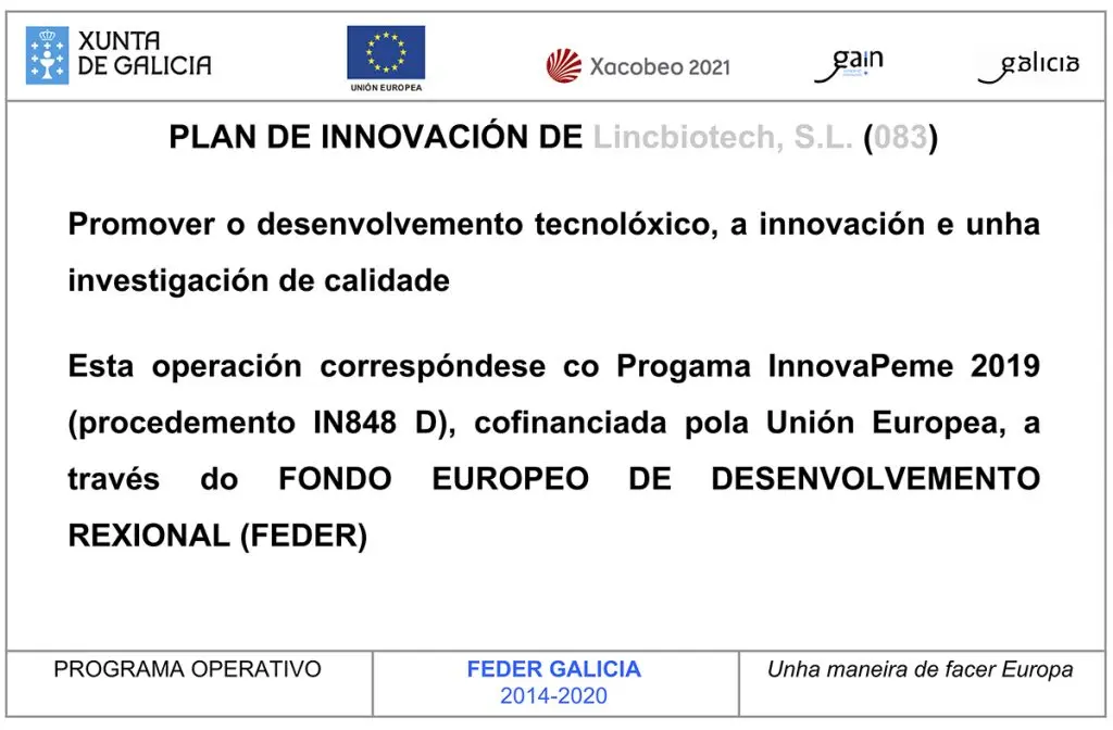 Lincbiotech ha sido beneficiaria de una ayuda parcialmente reembolsable de hasta 195.758,03€ encuadrada dentro de la convocatoria 2020 de emergencia sanitaria “COVID-19” del CDTI, ayuda cofinanciada por el fondo europeo de desarrollo regional (FEDER) a través del programa operativo plurirregional de España 2014-2020. El proyecto tiene como objetivo principal desarrollar un kit de diagnóstico rápido del virus SARS-COV-2 en cromatografía de flujo lateral.