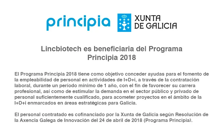 Lincbiotech ha sido beneficiaria de la ayuda encuadrada dentro de la convocatoria 2019 de proyectos de I+D+i “Retos colaboración” del Programa Estatal de Investigación, Desarrollo e Innovación Orientada a los Retos de la Sociedad, en el marco del Plan Estatal de Investigación Científica y Técnica y de Innovación 2017-2020.